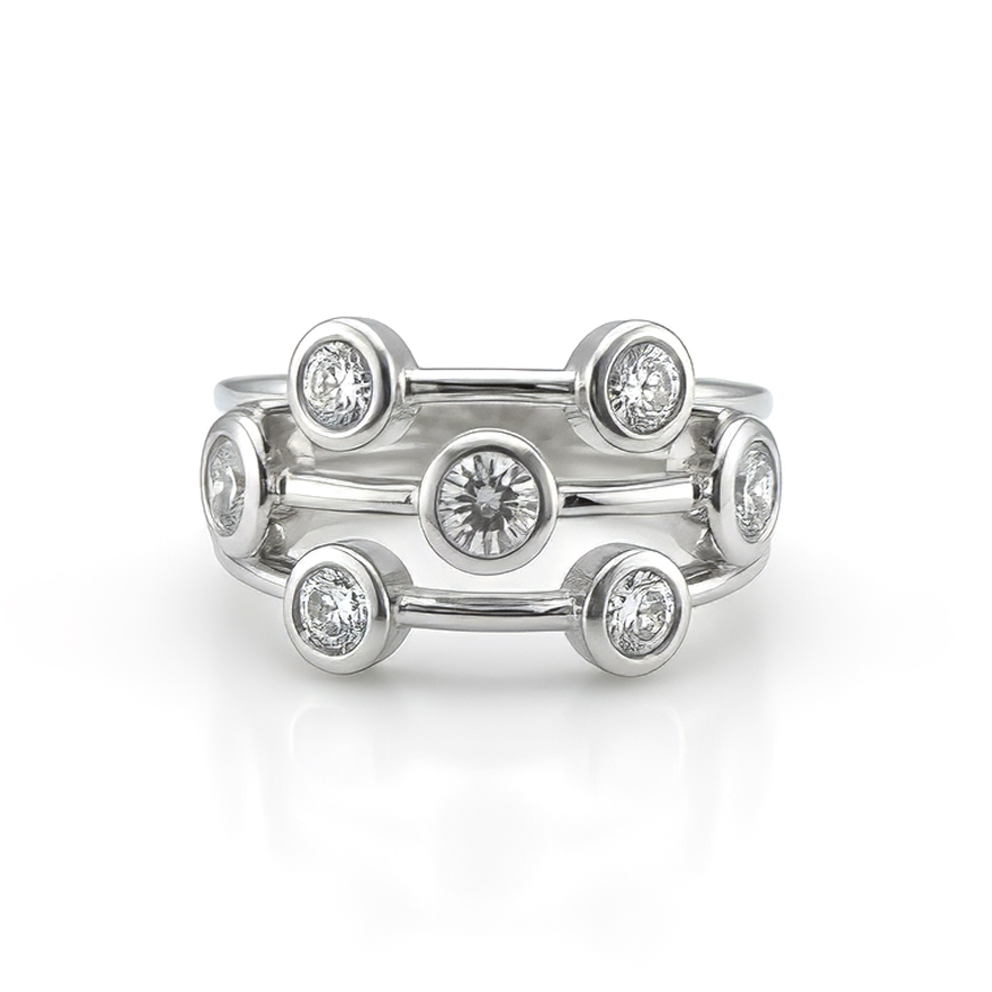 Platinum bezel set multi-stone ring. Laboratory grown, round brilliant cuts, F-VS2, 1.06ct total.
