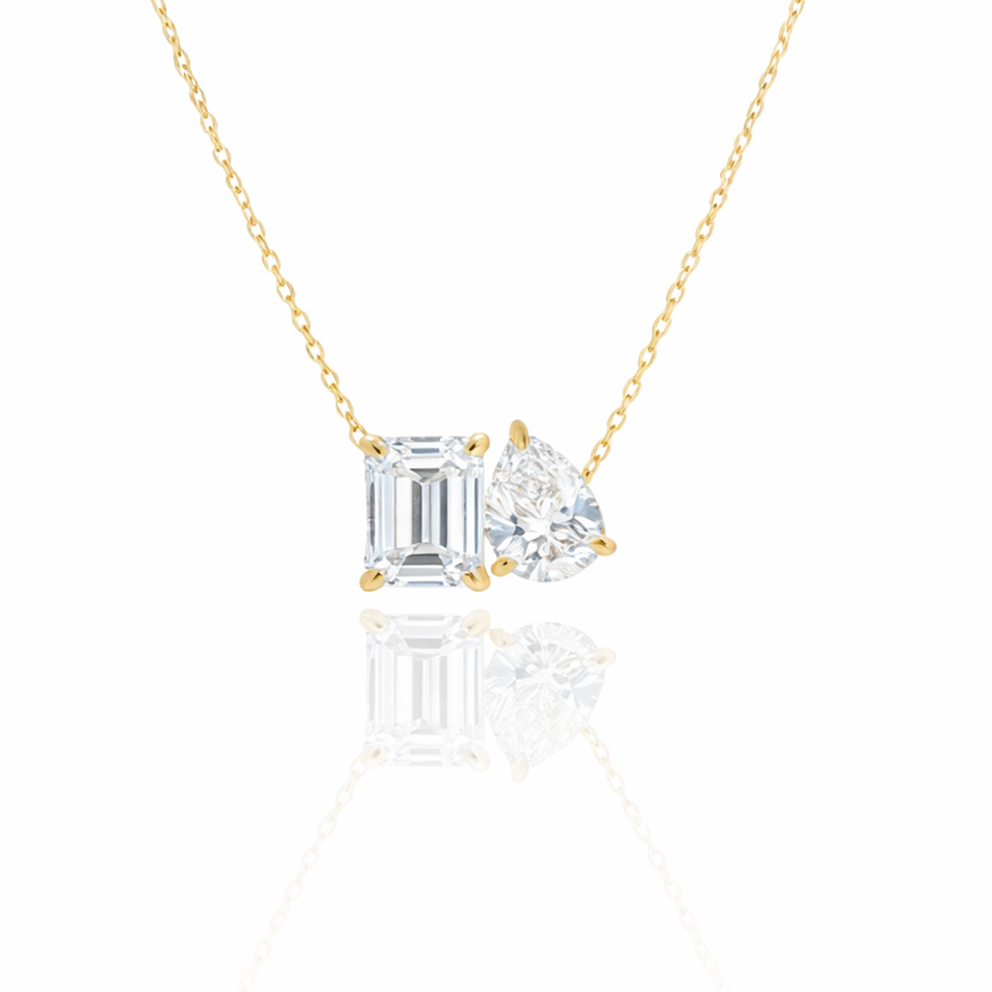 18ct yellow gold Toi et Moi set pendant. Laboratory grown, emerald cut and pear shape diamonds, D-F, VVS-VS, 1.57ct total.