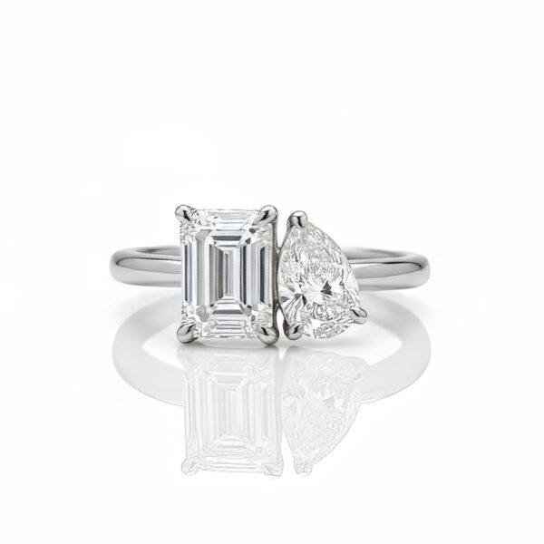 Platinum set Toi et Moi style ring. Laboratory grown, emerald cut and pear shape diamonds, F-VS2, 2.10ct total.